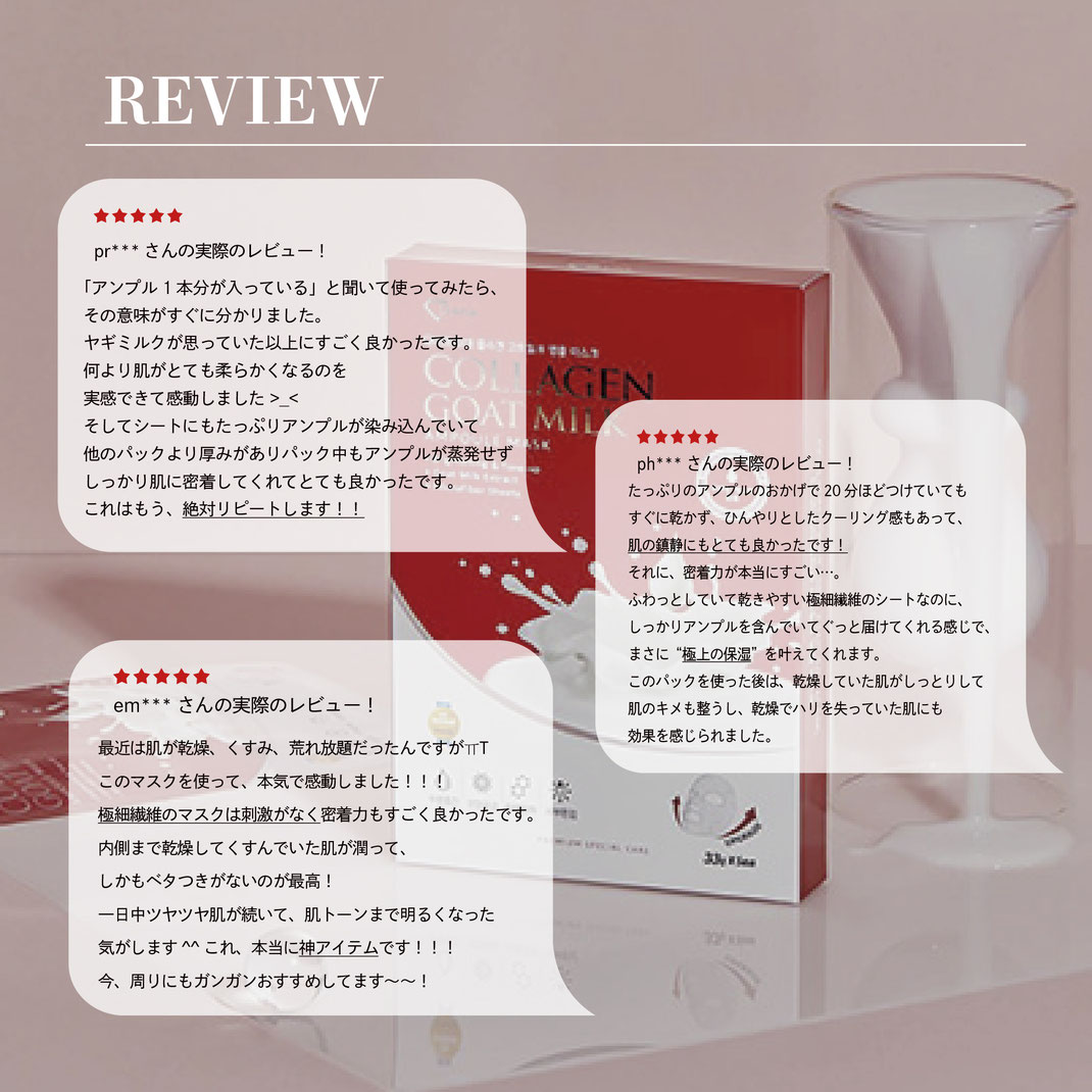 水、BG、グリセリン、トリ(カプリル酸/カプリン酸)グリセリル、ナイアシンアミド、ジメチコン、エチルヘキサン酸セチル、1,2-ヘキサンジオール、ポリソルベート60、水添ポリデセン、フェノキシエタノール、ステアリン酸グリセリル、(アクリロイルジメチルタウリンアンモニウム/VP)コポリマー、ステアリン酸PEG-100、ヤギ乳エキス、エチルヘキシルグリセリン、キサンタンガム、ポリアクリル酸Na、香料、EDTA-2Na、ティーツリー葉水、ウンシュウミカン果皮エキス、β-グルカン、クロフサスグリ果実エキス、ローブッシュブルーベリー果実エキス、加水分解エラスチン、ローズマリーエキス、セージエキス、カミツレ花エキス、ラベンダーエキス、セイヨウハッカエキス、シルクアミノ酸、加水分解コラーゲン、ユビキノン、パルミトイルトリペプチド-5、アセチルヘキサペプチド-8